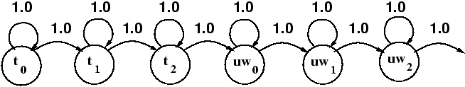Hint 2: The HMM structure you should assume for each word is technically a "left-to-right non-skip self-loop 3-state HMM". That means that each phone has exactly three substates, that you can't skip any of these states, and that they all have a self-loop. In addition, I assume all the state transition probabilities are 1.0. Technically this means that they aren't true probabilities (if they were true probabilities, they would have to be 0.5, since the two arcs leaving each state must sum to 1). But in practice, since all that matters is that they are all equal, it makes things simpler to just assign everything a probability of 1, since the log of 1 is 0; that means you can just ignore the probabilities altogether, except for the word transition penalty. Anyhow here's an example for the word "two":