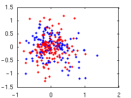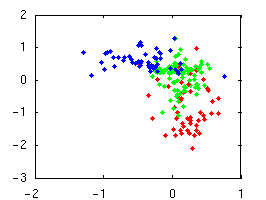 Our primary focus is on grammar induction, which aims to find the hierarchical structure of natural language. Grammar search methods have met with little success, and simple distributional approaches that work for part-of-speech induction do not directly apply. For example, differentiating noun phrases, verb phrases, and prepositional phrases requires discovering the three clusters in the left plot -- which seems easy enough. However, deciding which sequences are units at all requires telling apart the red and blue clusters on the left -- which is much harder.