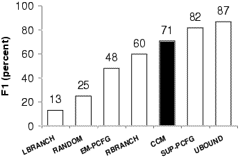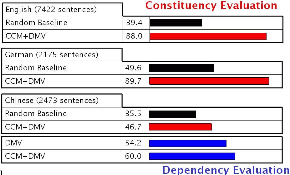 A complementary approach to induction is to focus on relationships between word pairs, or dependencies. Previous work using this approach was quite unsuccessful because it used too simple a dependency model. Our model, borrowing ideas of word classes and valence from supervised parsing dependency models, performs well above baseline. Combining it with the CCM model via a factored model gives extremely good results, as shown below.